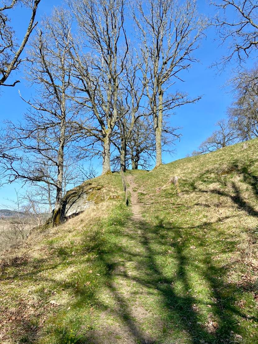 Jag parkerade och vi gick in på området. Först visste jag inte exakt var borgen funnits men det fanns bara en stig att gå. Så småningom dök det upp skyltar med information och en enormt hög kulle tornade upp sig. Skylten informerade om att vägen upp bara var en km lång, men bitvis brant. Jag tog mig en allvarlig funderare, men insåg att jag inte kommer att bli yngre och att mitt skadade knä inte kommer att bli bättre, så det var nu eller aldrig, liksom. Och sen började vi gå.